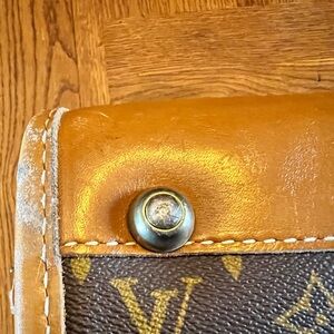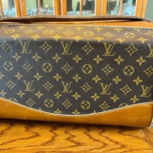 From back in the day when we travelled in style (no TSA plastic bags then)! This has been sitting in a closet for at least 25 years, but originates in the early 80’s, when The French Company was licensed to manufacture LV in the US. Fully lined in a vinyl-like material with straps to hold toiletries. Also a removable tray and vanity mirror. In very good condition, flaws are not overly apparent. All stitching is intact. Some scuffs and scratches, which are to be expected. Handle strap is strong. All 4 metal feet intact on bottom. It’s rather heavy, weighing in at 5.2 lbs. or so. Approximate measurements are 16” across, 9” tall, and 9” deep. These are getting harder and harder to find!