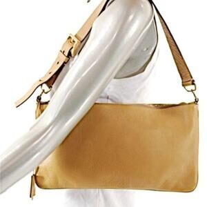 Simple design with adjustable shoulder straps and gold hardware - nice and flat to tuck right under your arms - fully lined in leather with one zip pocket
