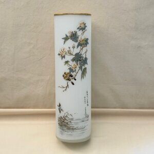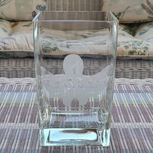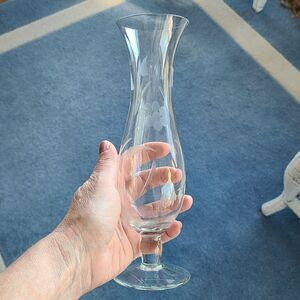 Enhance your home decor with this elegant vintage clear glass vase. Its intricate design adds a touch of sophistication to any room.