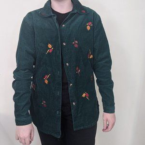 Adorable vintage hunter green corduroy button up shirt with embroidered fall / autumn leaves all over the front and the collar. So cute! Could easily be cropped for a more modern feel, or worn long and oversized for cozy autumn vibes. This is a shirt made for pumpkin patches and apple picking ๐๐๐๐พ brand is Bobbie Brooks, tagged a size medium, fits more like a large.
