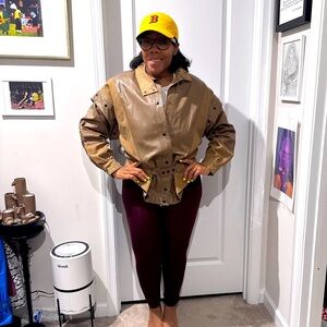 Vintage Avanti Leather Flight Bomber Jacket, Convertible Vest with Removable Sleeves. Sleeves can be removed by zipping them on and off. There isn’t a size tag but it fits a size Large comfortably. It is 80’s / 90’s style.