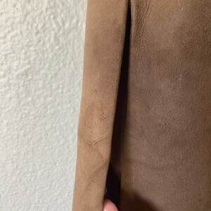 Good used condition! Tan suede leather car coat. Covered 3-button closure and fully lined in satin. Luxurious fur collar. Long sleeved in a trench longline style. Some imperfections/spots throughout. Please see all photos.