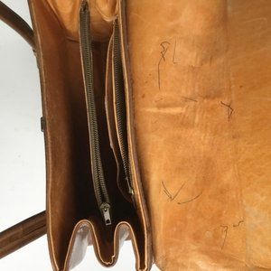 Item shows wear that is consistent with age and use. Most notably, there are pen marks in the interior and some wear to the exterior leather. Slight musty smell from storage.