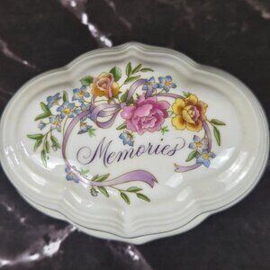 Sweet trinket box has a fully removable floral lid with the word "Memories" in script. The interior of the box has the words "...are for Sharing" to finish the sentiment. Turn the lid over to wind the box and music will play when the box is opened. Marked Avon 1983 on the bottom. A sweet gift for a loved one.