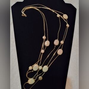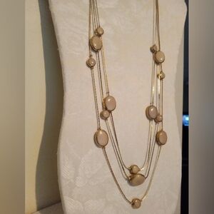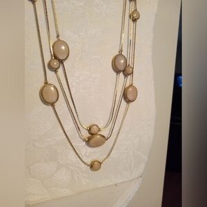 This is vintage and is 29 inches long total. It is a 3 strand station chain necklace by Avon. The color of the Cabochons are tan. Some devices may show the color in varying tones.