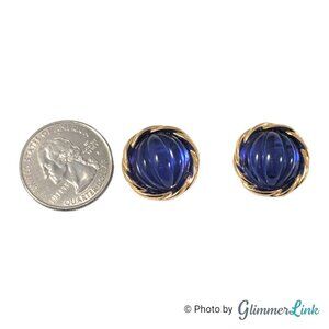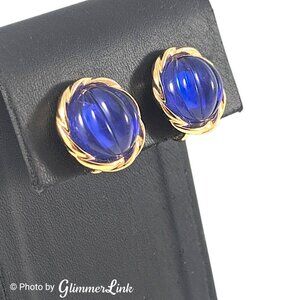 Vintage 1996 Avon "Raj" gold tone runway clip on earrings featuring a blue ribbed domed Lucite stone.