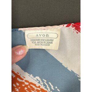 This vintage Avon scarf features a striking abstract pattern in vibrant red, orange, and blue hues. Made from 100% polyester, it's lightweight and versatile. Designed exclusively for Avon in Japan, this accessory adds a touch of vintage flair to any ensemble. A timeless piece showcasing bold artistry.