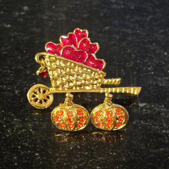 This charming vintage jewelry set includes Avon earrings and a pin featuring apples and pumpkins with rhinestone accents, perfect for adding a touch of fall elegance to any outfit.