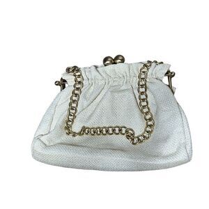 What a fabulous handbag! Fabric is a cream color with gold metallic inlay. Features twist toggle closure, linen lining, gold hardware, inside zippered pocket, and also slide pockets. Bag is flawless!  Measures 13" wide, 8.5" tall, and 3" deep.