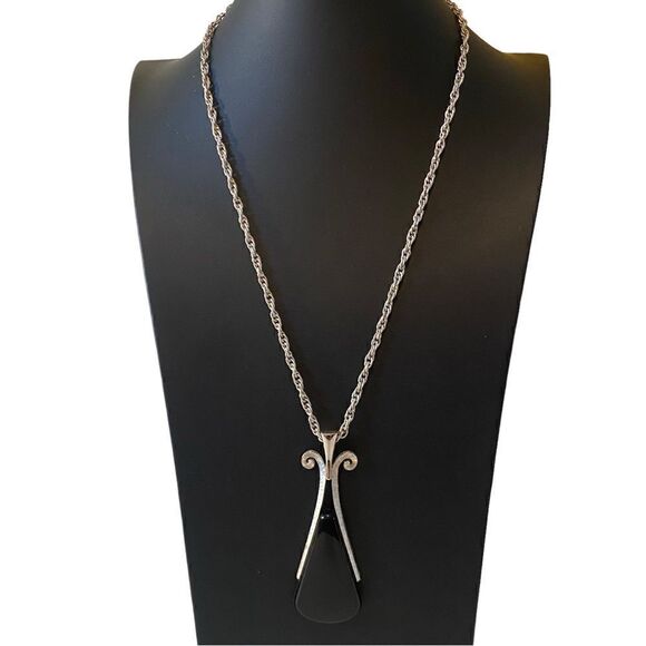 Vintage Avon Black Drop Pendant Statement Necklace on Silver Toned Rope Chain.
