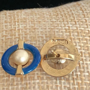Vintage Avon Blue Enamel Faux Pearl Stud Earring Set Nautical Gold Tone Circle