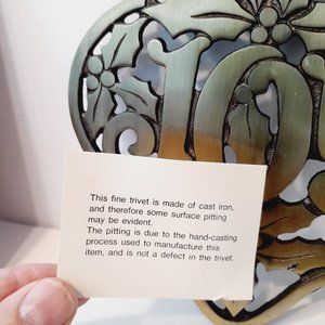 Trivet is made by Avon from the 70's and is made of cast iron with a brass coated finish