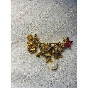 Vintage Avon Brooch Enamel Butterfly Pearl Dangle Gold Tone Bee Flowers 4119