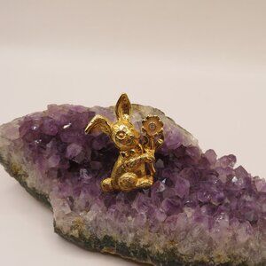 Vintage Avon Bunny Holding Enamel with Rhinestone flower. Gold Tone.