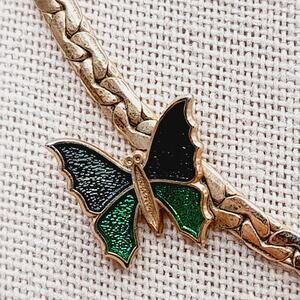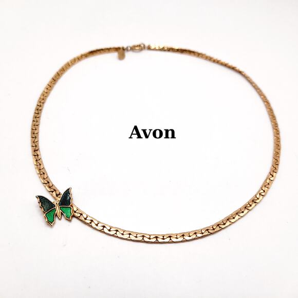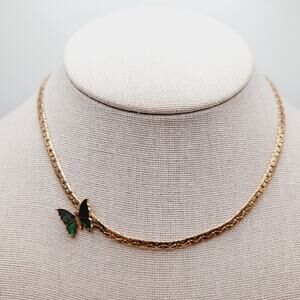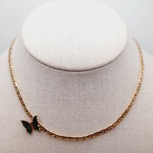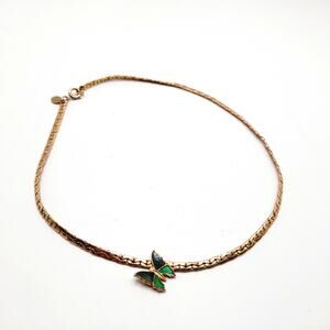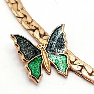 This is a lovely vintage Avon necklace featuring a side-set butterfly accent in green and black enamel. The butterfly is securely attached to a gold tone textured chain that measures approximately 14 3/4 inches in length, making it a striking choker-length piece.