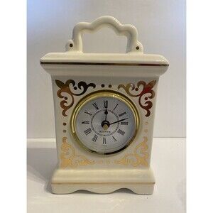 Beautiful and collectible vintage Avon ceramic carriage clock, complete with its original box and battery replacement instructions. This charming piece features classic Victorian-style gold detailing, Roman numeral clock face, and a glossy ivory finish—perfect for adding a touch of timeless elegance to any room.