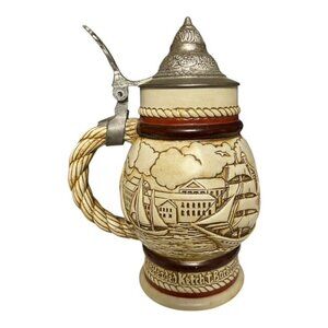 This collectible Avon beer stein features a detailed nautical design with ships, coastal buildings, and rope-style handle. Crafted in 1977 in Brazil exclusively for Avon Products, it includes a hinged pewter lid with ornate detailing. A great piece for collectors of vintage steins, Avon memorabilia, or maritime décor.