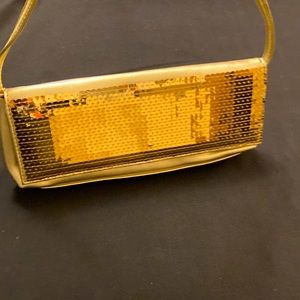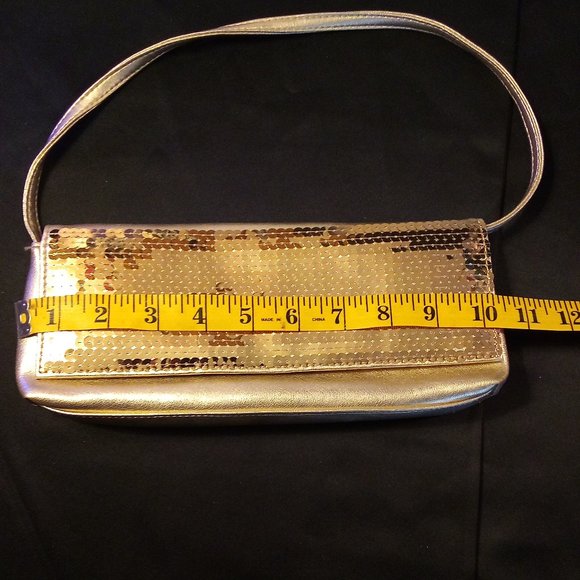 Avon Slim Gold Sequins on the Front with room inside for phone, lipstick, compact, etc. Go from Mini Bag to Wristlet by Easily Pulling the handle through the loops inside the purse, then use snaps to secure the handle. Has an original Key Ring with a Small Mirror. Measures 3 Inches Length, 10 Inches Width and the Handle Measures 18 Inches.