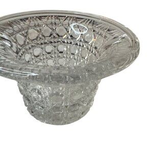 This intricately designed vintage Nova crystal basket features a stunning diamond-cut pattern and a gold-tone handle. A timeless, decorative accent.
