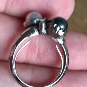 Silver toned rope style with white and grey faux pearls pin and adjustable ring that will fit size 6 to 8.