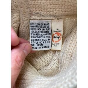 Women, vintage, medium, mock neck, pearl button, dolman sleeve, long sleeve, silk, angora, ramie, nylon, acrylic, wool, knit, fall, winter, soft, cozy, floral, ribbon.