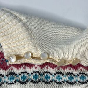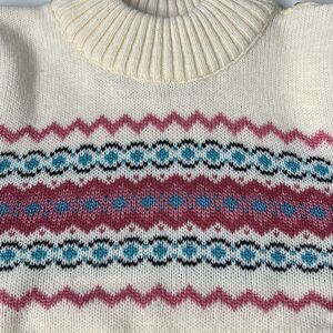 This is a vintage 2 pc acrylic sweater set by Avon Fashions. It is a cream color with pink, blue, and black knitted pattern. The sweater has the gathered puffy shoulders and 5 original buttons for closure. PLEASE see the measurements!!! They are listed as small but nowadays they may be more XS. No holes.