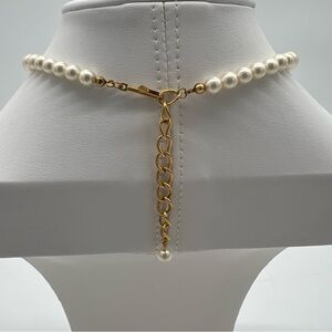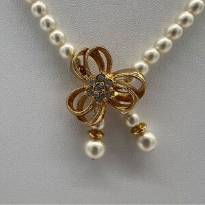 Vintage Avon Faux Pearl Necklace Gold Bow Rhinestone Drop Pendant Adjustable