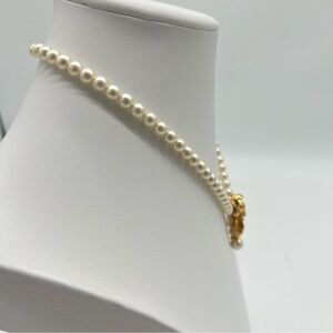 Add timeless elegance to your jewelry collection with this vintage Avon faux pearl necklace featuring a gold-tone rhinestone-studded bow pendant and double pearl drops. The adjustable clasp ensures a perfect fit, and the piece is signed AVON on the back of the pendant.