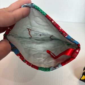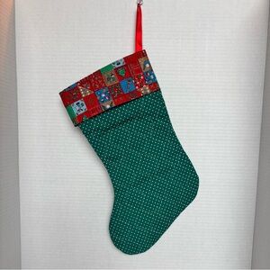 • The stocking cuff is made of a patchwork-style Christmas-themed fabric.