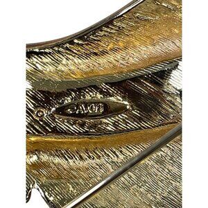 This vintage Avon brooch is a sophisticated accessory, featuring a gold and silver leaf design adorned with rhinestones. The intricate detailing highlights its timeless elegance, making it a valuable addition to a jewelry collection. Its versatile design complements various outfits, adding a touch of classic charm.
