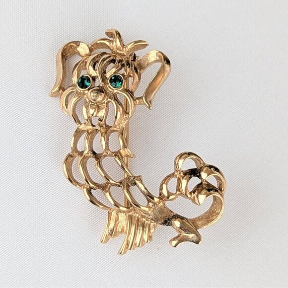 This vintage Avon gold-tone brooch features an adorable openwork dog design, complete with sparkling green rhinestone eyes that add a touch of charm. Likely dating from the 1970s, this signed Avon piece showcases the playful, timeless appeal of retro animal jewelry.