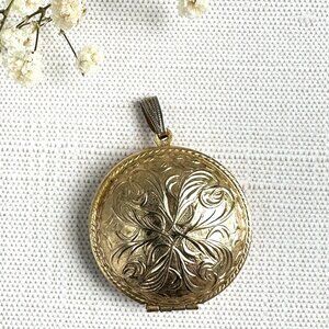 This vintage Avon locket pendant features a delicate floral engraving and gold tone finish. Versatile as a perfume holder or keepsake charm.
