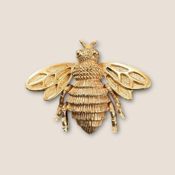 A charming bee brooch with intricate gold-tone detailing. Ideal for adding a touch of elegance and nature-inspired flair to your outfits.