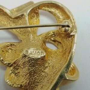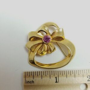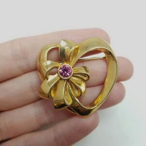 Vintage Avon Heart and Bow Shape Brooch, Gold Tone and Pink Rhinestone Pin