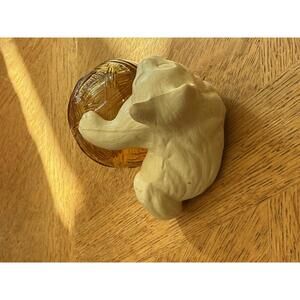 Decorative cat figurine holding an amber-colored glass yarn ball.