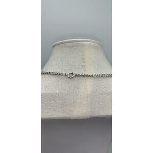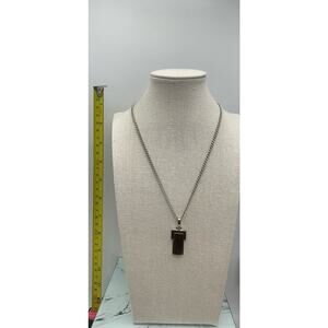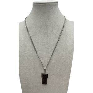 This vintage Avon necklace features a modernist silver tone wooden pendant with a spring ring closure. The necklace is signed and has a brown main stone color. The pendant hangs on a silver colored chain and the whole piece has a beauty, modernist and art theme. This necklace is perfect for women who love vintage jewelry and would make a great addition to any collection.