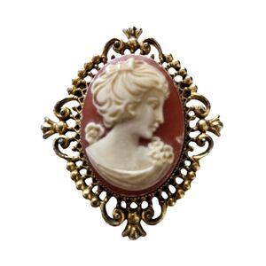 Add a touch of vintage charm to your jewelry collection with this Avon perfume cameo gold tone locket brooch. The oval-shaped brooch features a lab-created acrylic cameo as its main stone, with a creamy color that gives it a unique and timeless appeal.