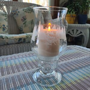 This candle display is two pieces, with lower piece specially designed to be filled with water before lighting candles in the hurricane