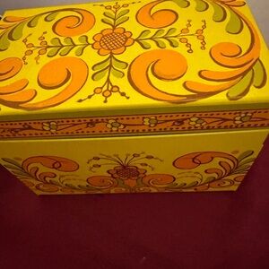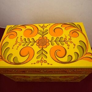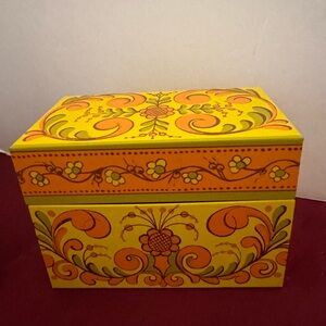 The product is a vintage Avon Recipe Treasures box, featuring a floral pattern in a retro style. This recipe box, measuring 3.5" in height and 5.25" in width, is designed for adult use and comes in a vibrant orange color. Perfect for collectors or those looking to add a touch of nostalgia to their kitchen storage and organization needs, this item is a charming addition to any vintage decor.