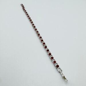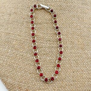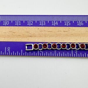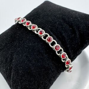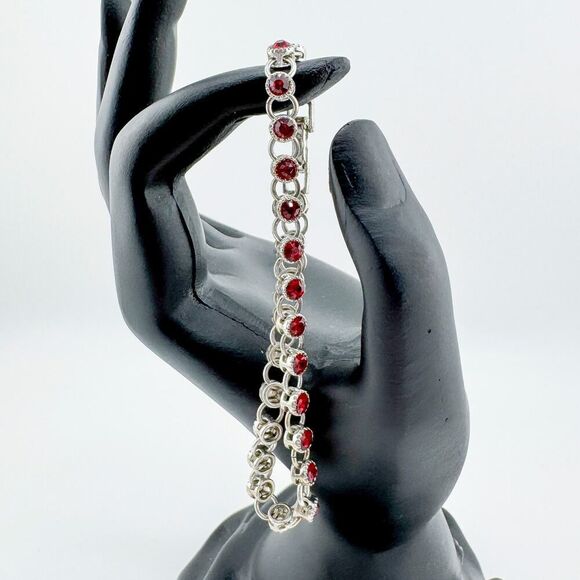 Step back in time with this elegant vintage Avon tennis bracelet. Crafted with a dazzling row of vibrant red rhinestones, this bracelet exudes a glamorous & sophisticated vibe. Perfect for adding a touch of retro charm to any outfit, this timeless piece is sure to make a statement.