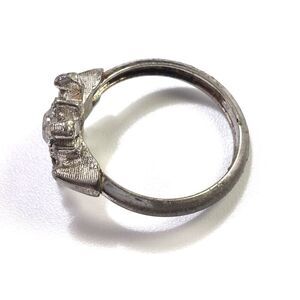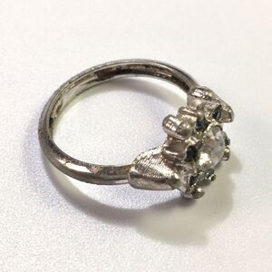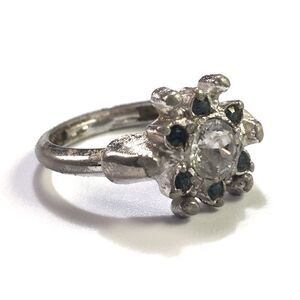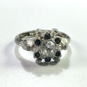 This vintage Avon ring from 1974 features a stunning starburst design with blue rhinestones that were made to imitate sapphires. Made with silver plating and a clear or colorless main stone shape, this ring is a perfect accessory for any occasion. The ring size is 7.5 and is designed for women. The brand is Avon and the metal purity is unknown. The band measures about 2mm wide. It is in poor condition with heavy wear throughout (wear on the stones, the finish, and the metal).