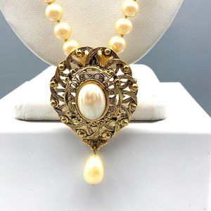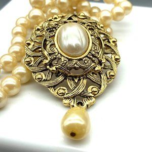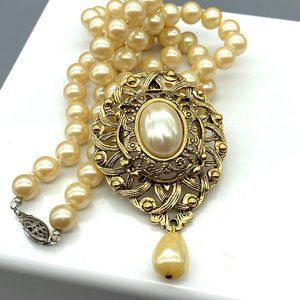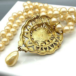 Vintage Avon Romantic Interlude Brooch and Enhancer Pendant on Lustrous Glass Pearl Necklace, Classy Occasion Strand