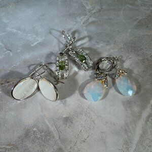 In a world of elegance and charm, three pairs of exquisite earrings await. Each piece tells its own story. The shimmering mother-of-pearl whispers tales of the sea, the opal shines with a mystical glow, and the green crystals sparkle like emerald dreams.