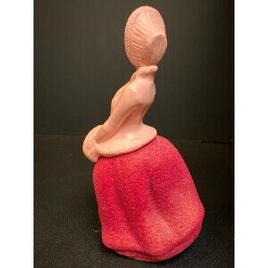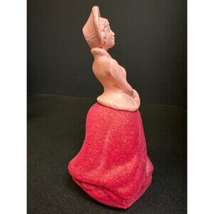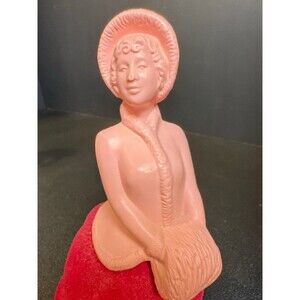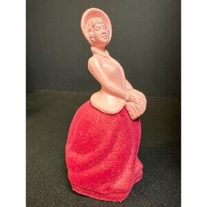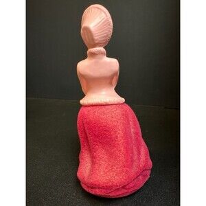 Charming vintage Avon cologne bottle from the 1970s, called Skater’s Waltz, featuring the Moonwind fragrance. The bottle is shaped like a woman in winter attire with a bonnet and red flocked skirt.