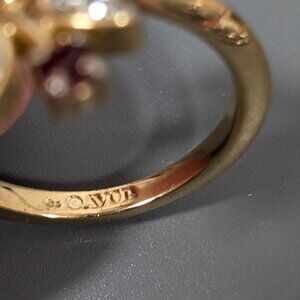 This vintage Avon spray ring features a gold tone finish with a faux ruby birthstone. Perfect for collectors or as a unique gift, it is a size 7.75, offering elegance and timeless style.