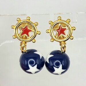Classically beautiful pair of clip-on earrings features a ships wheel and navy blue drops with bright white stars, these earrings bring a 40s or 50s era feel to your outfit. Perfect for modern day vintage or 40s/50s inspired outfit.