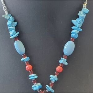 This beautiful piece is a vintage Avon necklace featuring a striking teardrop pendant design. The faux turquoise and coral stones are arranged in a floral-like pattern, with large oval-shaped faux turquoise cabochons encircling a central faux coral accent, adding a pop of color. The necklace is composed of double chains, extending over 20 inches in length, and includes additional faux turquoise chips and beads interspersed with small coral-colored beads along the chain. The unique combination of colors gives the piece a vibrant and classic Southwestern style, perfect for those looking to make a bold fashion statement with a vintage twist.