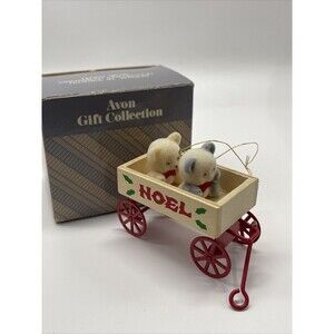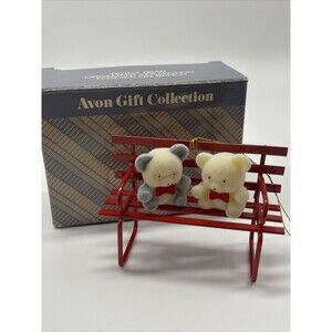 Vintage adorable Christmas ornaments by Avon all with fuzzy little teddy bears. This lot consist of teddy bear ornament teddies in wagon, teddy bear ornament teddy on sled, teddy bear ornament teddy on tricycle and teddy bear ornament Teddys on bench. All are still in original box. Wonderful pieces for the collector in excellent condition. Comes from a smoke free home.