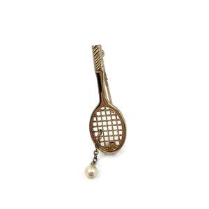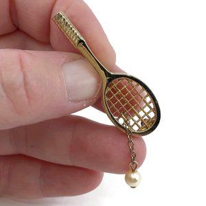 Vintage Avon Tennis Racket Brooch Faux Pearl Dangl