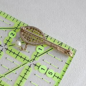Vintage Avon Tennis Racket Pin Brooch Gold Tone Faux Pearl Ball Attached